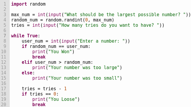 Aufgabe: Bevor der Nutzer raten soll, lese zwei Zahlen ein. Lese zuerst das Maximum der Reichweite ein in der die Zahlen generiert werden sollen. Der Nutzer muss dann Zahlen zwischen 0 und der eingegebenen Zahl raten. Lese danach eine Zahl ein wie viele Versuche der Nutzer haben soll um die Zahl zu erraten. Die Lösung findest du weiter Unten.